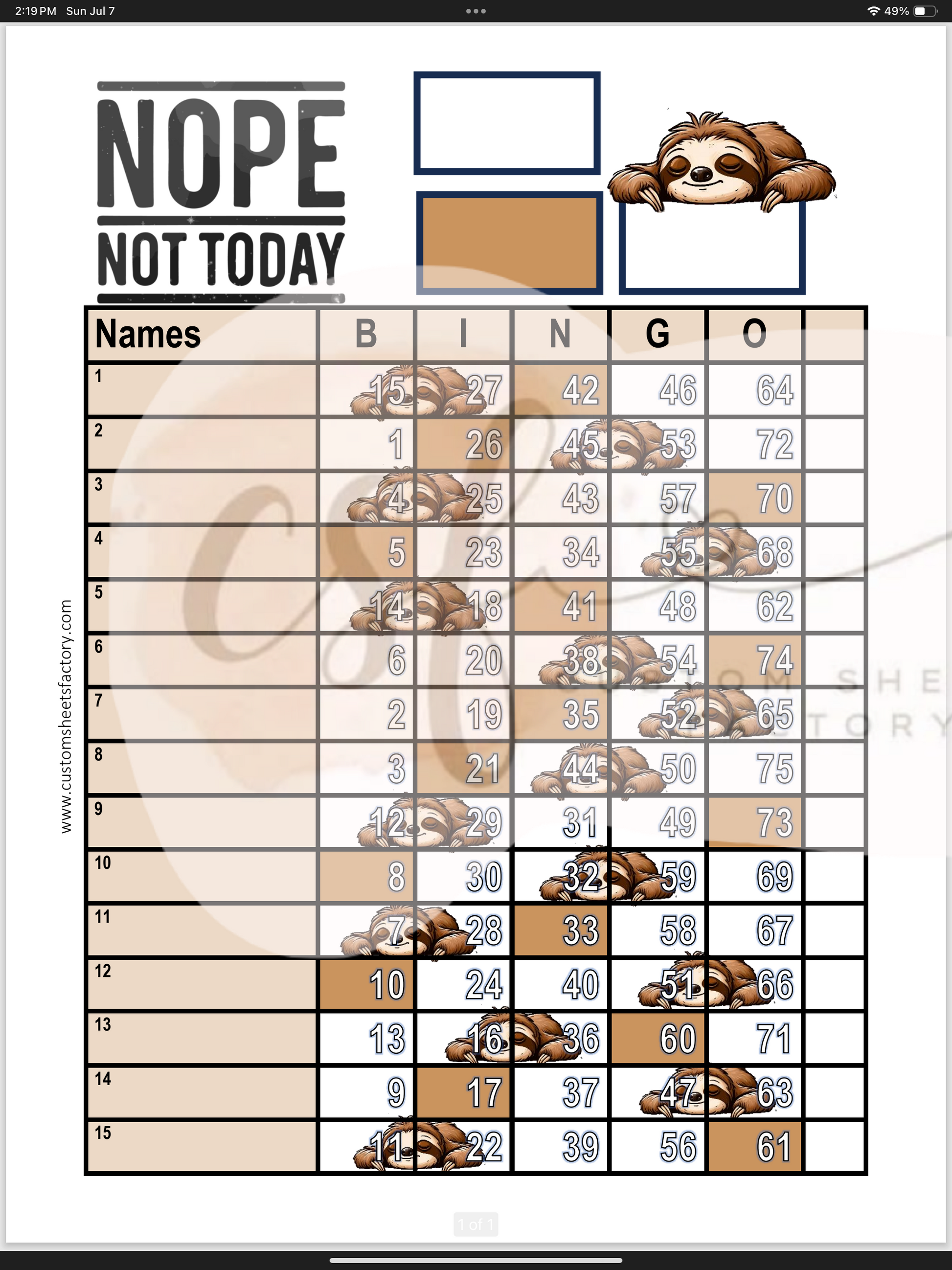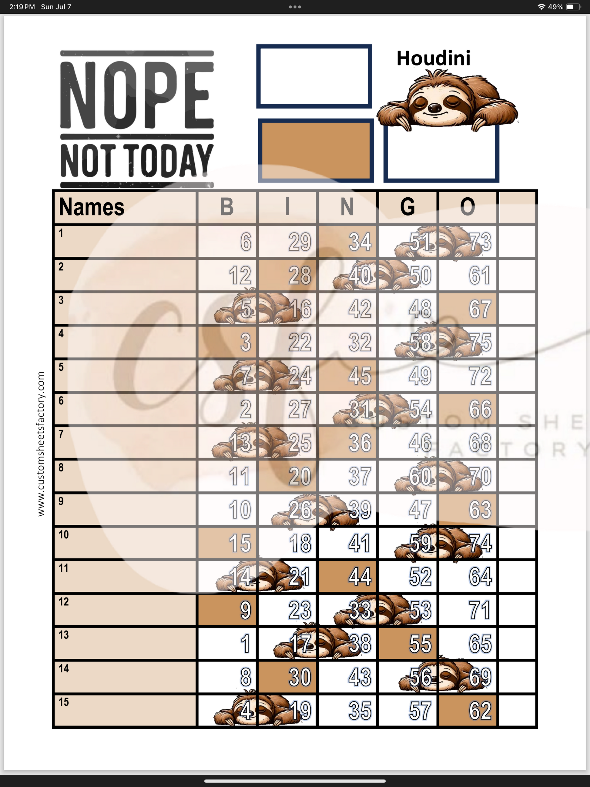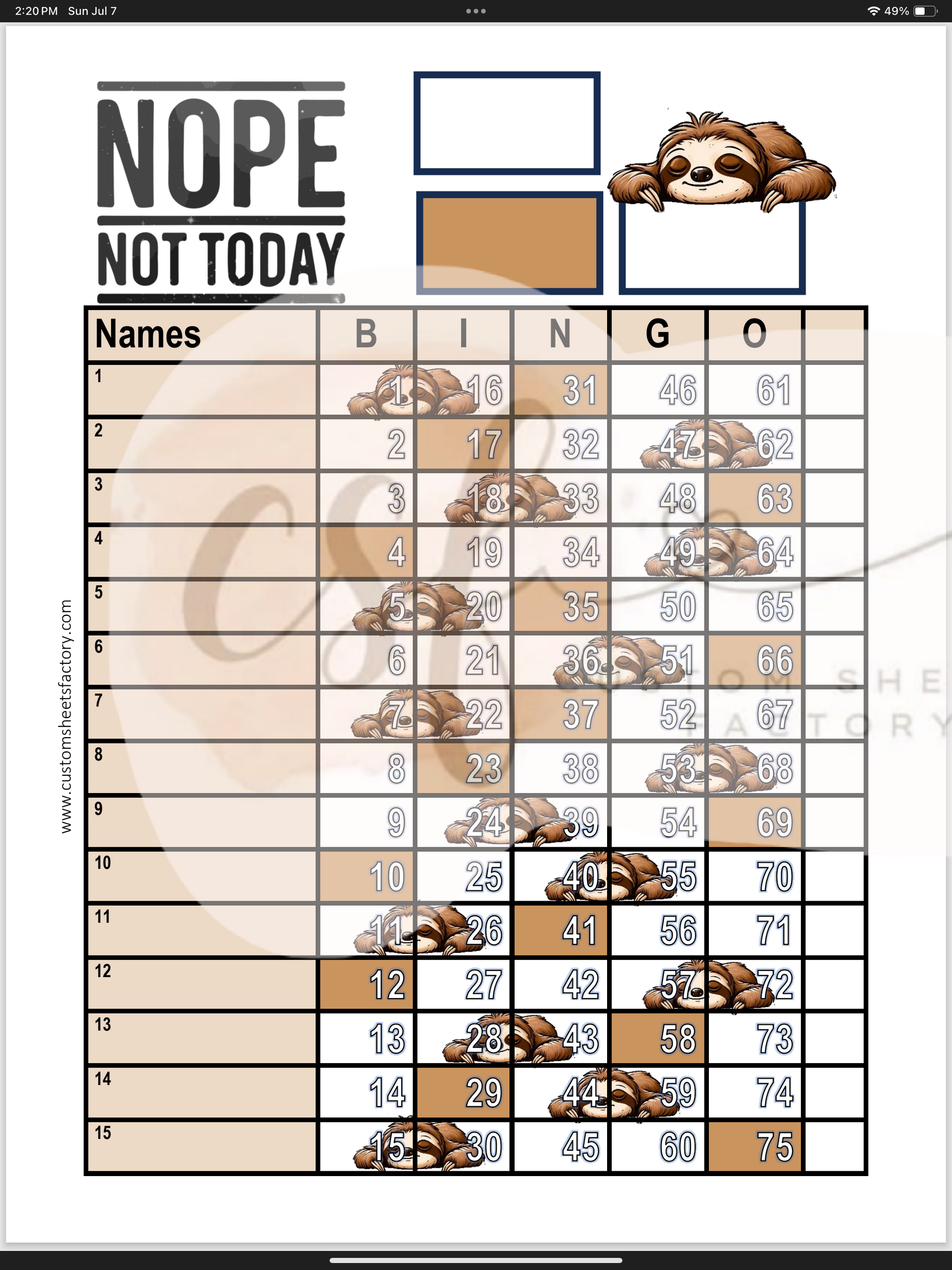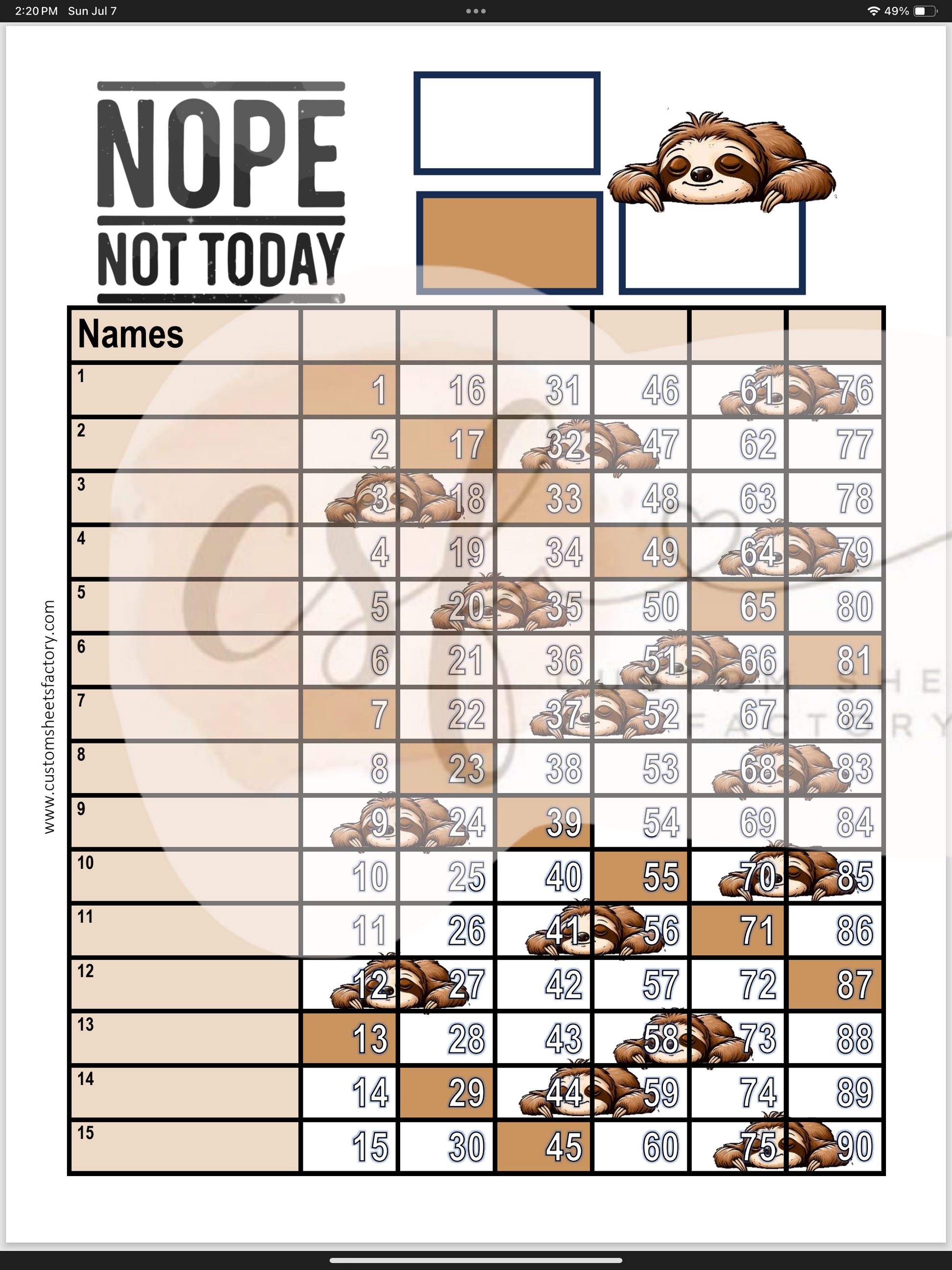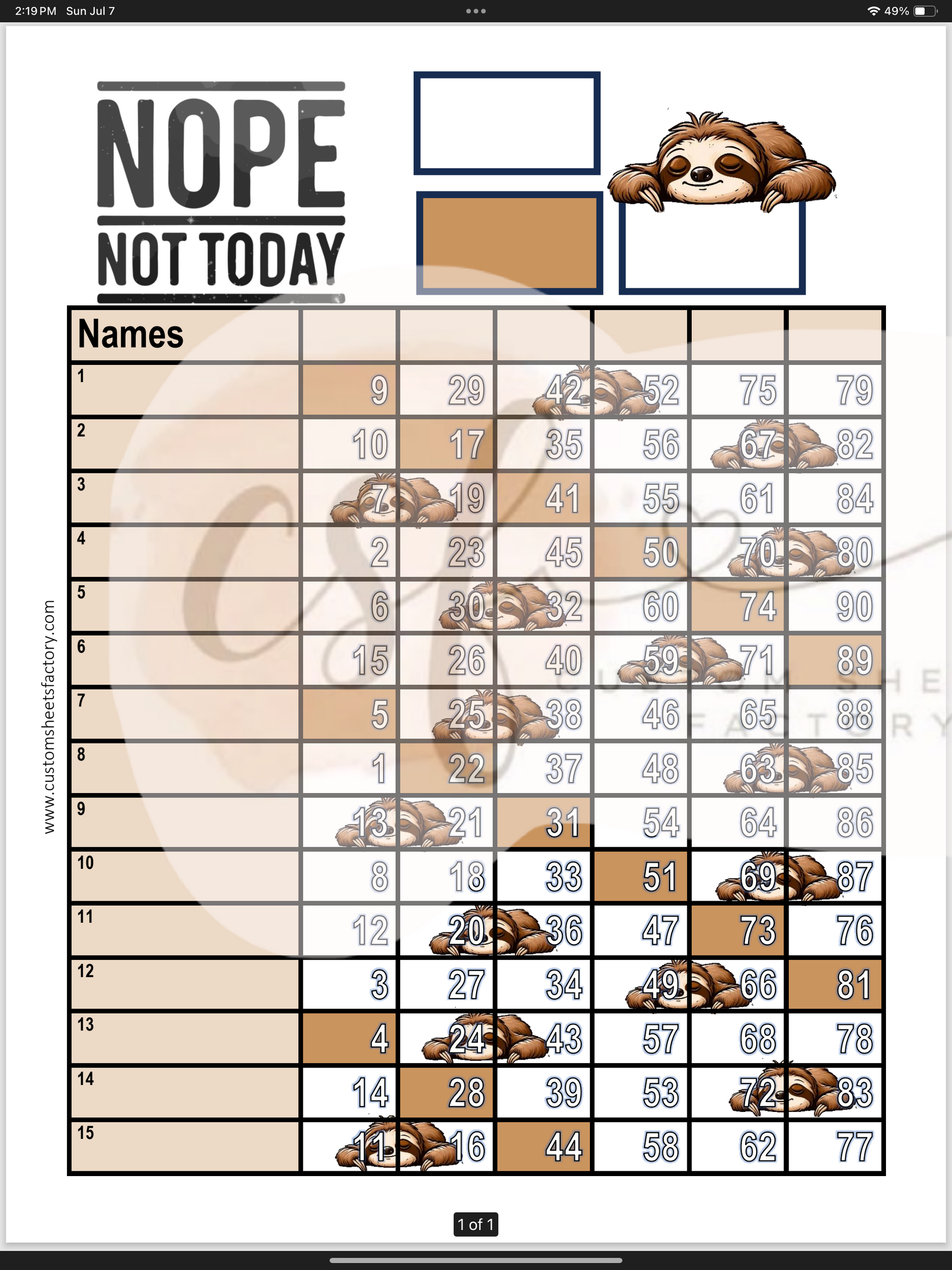 Nope Not Today Sloth - 15 Line - 75 & 90 Ball